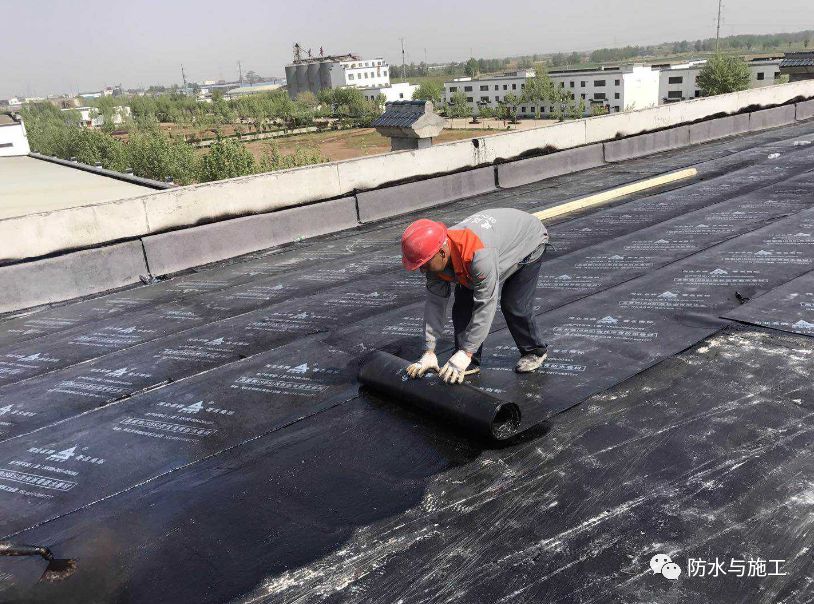 4.卷材铺贴时要避免过度拉紧和皱折,基层与卷材间排气要充分,向横向两侧排气后用辊子压平粘实。
